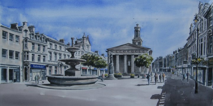 Jason Liosatos painted this watercolour of Elgin high Street. Jason has a distinctive style that uses hints of colour to bring out the detail in the buildings. We liked this one so much, we bought it! More of Jason's work can be found in the Hopeman Gallery.